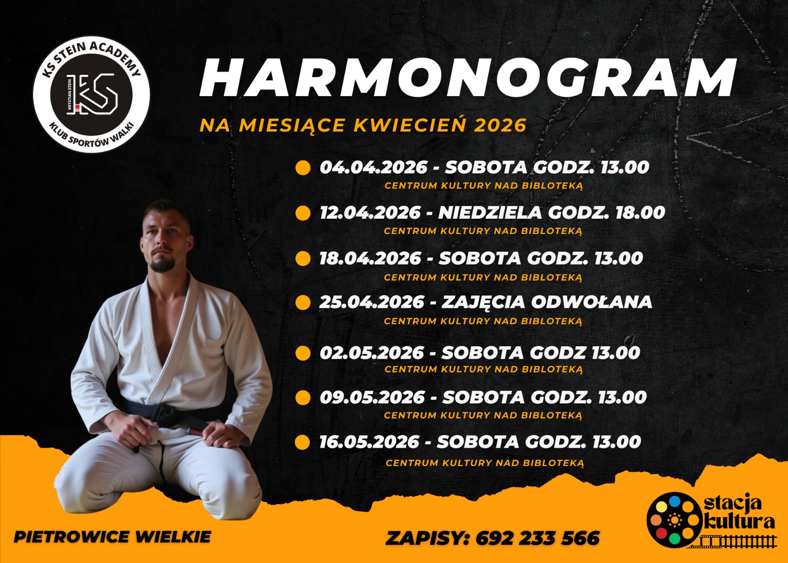 Wybór miejsca na nasz klub nie był przypadkowy. Postawiliśmy na Pietrowice Wielkie obok Raciborza. Sala na której trenujemy jest duża i przestronna, wyposażona w maty akrobatyczne oraz profesjonalne puzzle tatami do sportów walk. Pietrowice Wielkie to idealna lokalizacja z dala od centrum dużych miast. Pond budynkiem znajdziecie ogromny darmowy parking. A zaraz obok sali znajdują się sklepy gdzie rodzice podczas zajęć dzieci mogą iść na zakupy. Nasz adres to Pietrowice Wielkie ul. 1 maja 8b ( Centrum społeczno kulturalne w Pietrowicach Wielkich na II piętrze nad biblioteką )